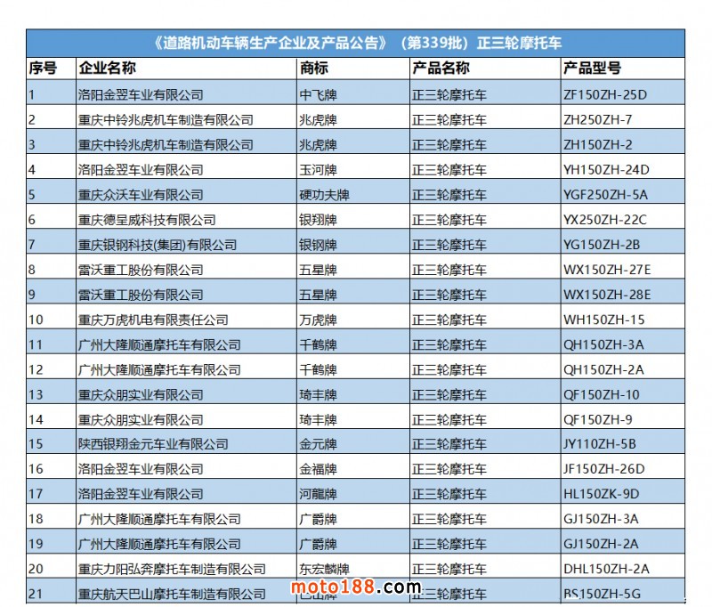 第339批公示的正三輪輕便摩托車品牌包括:中飛牌、兆虎牌、玉河牌、硬功夫牌、銀翔牌、銀鋼牌、五星牌、萬虎牌、千鶴牌、琦豐牌、金元牌、金福牌、河龍牌、廣爵牌、東宏麟牌、巴山牌,能上牌的21款產(chǎn)品型號見圖3。