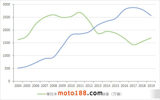 隨著禁行措施的出臺(tái)以及汽車工業(yè)的發(fā)展,在2011年全國銷量達(dá)到2692萬輛之后,摩托車銷量一路走低,到2017年一度跌破1500萬輛。