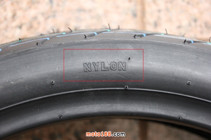 如圖所示,NYLON字母表示,該輪胎的胎面結(jié)構(gòu)為尼龍材質(zhì),有的稱為尼龍輪胎,輪胎的胎體簾布層、由數(shù)層掛膠簾布組成, 4P.R.代表的是采用4層簾線的結(jié)構(gòu)方式,當(dāng)然層數(shù)越多載重能力越強,通常摩托車還有子午線輪胎可以選擇,也就是俗稱的鋼絲胎,胎體和帶束層是由多層鋼絲簾布組成,有著強度高,負(fù)載能力大的優(yōu)勢,子午線的輪胎用符號R表示。