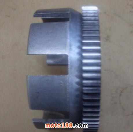 CL125-3春蘭虎摩托車是仿制本田CB125T的產(chǎn)品,該曲軸結(jié)構(gòu)中,如上面兩圖,曲軸右端面裝有高速齒輪,它與變速器連接的零件為裝在主軸右端面上的離合器主動轂大齒輪,如下圖,其連接方式為內(nèi)孔花鍵連接。