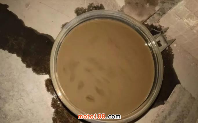 機油嚴重乳化現象時(如下圖),就必須立即更換新機油(有條件的可以用專用摩托車發(fā)動機清洗劑清洗一遍),以免乳化后的機油特性失效,導致發(fā)動機故障。