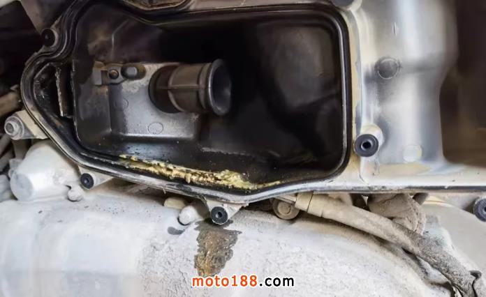 幸好排污孔也因機油氣體乳化把排污孔也堵塞的差不多了,才讓這臺踏板摩托車的發(fā)動機逃過一劫。