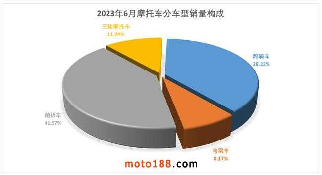 1-6月,跨騎車產(chǎn)銷366.18萬(wàn)輛和369.64萬(wàn)輛,同比下降4.67%和5.39%;踏板車產(chǎn)銷435.78萬(wàn)輛和401萬(wàn)輛,產(chǎn)銷量同比下降9.32%和18.78%;彎梁車產(chǎn)銷79.02萬(wàn)輛和78.8萬(wàn)輛,同比增長(zhǎng)2.53%和1.66%。從各車型銷量占二輪車總銷量的比重看,跨騎、踏板和彎梁三類車型占比分別為43.51%、47.21%和9.28%。