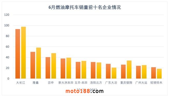 1-6月,燃油摩托車銷量前十名企業(yè)(集團(tuán))為大長(zhǎng)江、隆鑫、宗申、新大洲本田、五羊-本田、洛陽(yáng)北方、廣東大冶、重慶銀翔、廣州大運(yùn)、輕騎鈴木,分別銷售93.03萬(wàn)輛、50.3萬(wàn)輛、40.43萬(wàn)輛、37.84萬(wàn)輛、31.56萬(wàn)輛、31.22萬(wàn)輛、27.83萬(wàn)輛、26.36萬(wàn)輛、24.07萬(wàn)輛和21.44萬(wàn)輛。