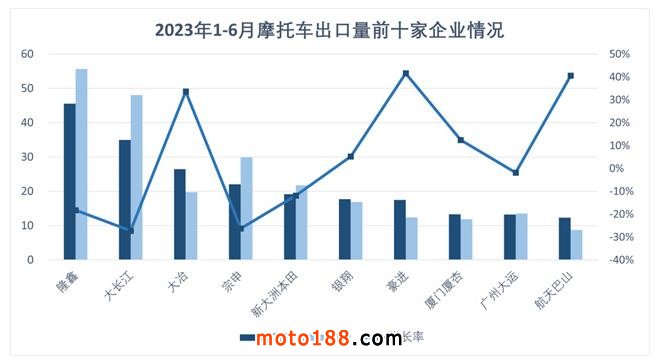1-6月,摩托車出口量排名前十位的企業(yè)依次為:隆鑫、大長(zhǎng)江、大冶、宗申、新大洲本田、銀翔、豪進(jìn)、廈杏、大運(yùn)、航天巴山,上述十家企業(yè)共出口222.18萬(wàn)輛,占摩托車出口總量的57.4%。
