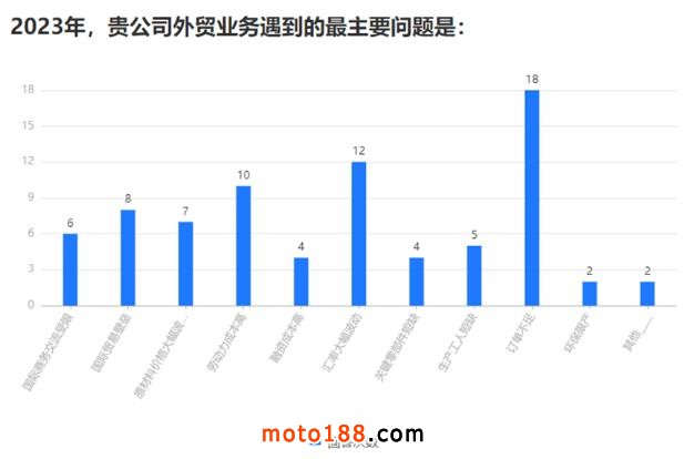 今年,導(dǎo)致企業(yè)出口的主要困難為:全球經(jīng)濟疲軟、通貨膨脹、購買力下降(23.8%),國際政治環(huán)境不穩(wěn)定、地區(qū)沖突(19.8%)及客戶換匯緊張(16.8%)。