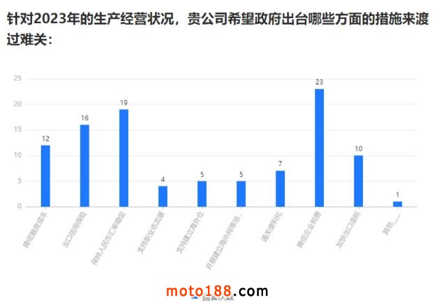 針對2023年的生產(chǎn)經(jīng)營狀況,企業(yè)希望政府出臺的主要措施有:降低企業(yè)稅費(22.5%)、保持人民幣匯率穩(wěn)定(18.6%)以及出口信用保險(15.7%)等方面。