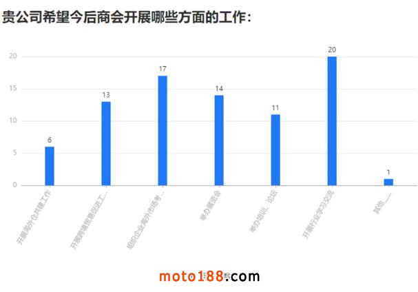 今后,開展行業(yè)學(xué)習(xí)交流(24.7%)、組織企業(yè)進行海外市場考察(21%)及舉辦行業(yè)展會(17.3%)等活動,是企業(yè)希望商會能重點開展的工作。