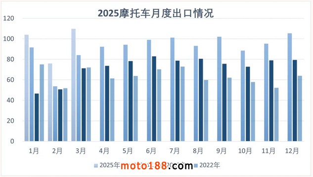3月摩托車出口109.78萬輛,環(huán)比增長42.44%,同比增長30.3%;出口金額11.68億美元,環(huán)比增長125.42%,同比增長118.42%。其中,二輪摩托車出口103.93萬輛,環(huán)比增長41.78%,同比增長29.82%;三輪摩托車出口5.85萬輛,環(huán)比增長55.39%,同比增長39.59%。