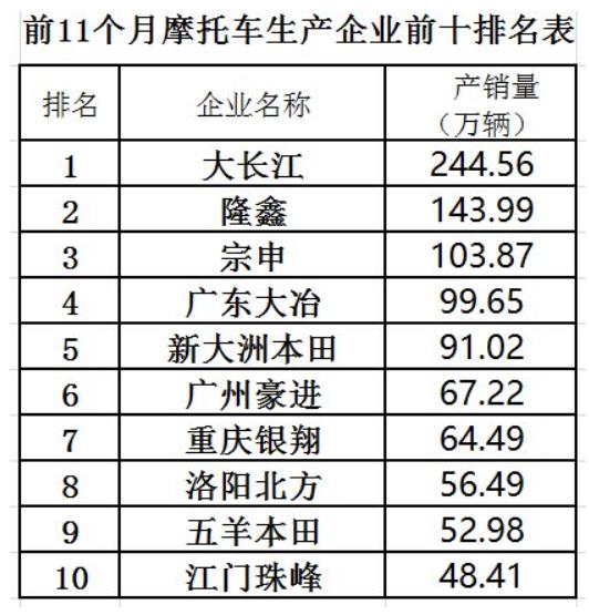 1-11月,燃油摩托車銷量前十名企業(yè)排名表如下: