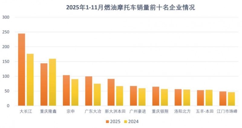 1-11月份,我國燃油摩托車銷量前十名的企業(yè)分別是:大長(zhǎng)江、隆鑫、宗申、廣東大冶、新大洲本田、廣州豪進(jìn)、重慶銀翔、洛陽北方、五羊-本田、江門市珠峰。
