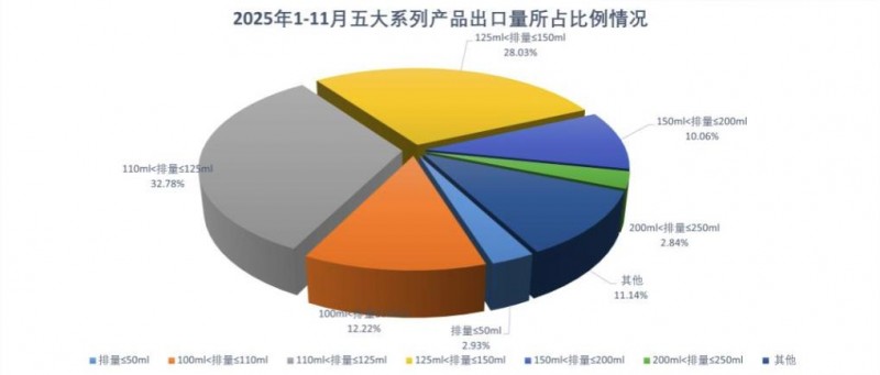 其中125系列同比增長(zhǎng)31.51%,150系列同比增長(zhǎng)8.16%,110系列同比增長(zhǎng)27.29%,200系列同比增長(zhǎng)29.44%。以上細(xì)分排量車型共出口了1073.65萬輛,占二輪摩托車出口總量的93.27%。