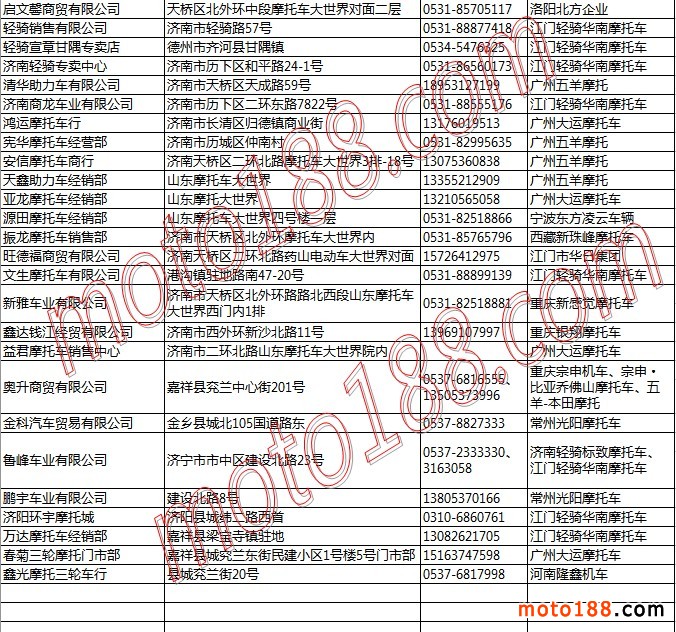 山東省摩托車整車經(jīng)銷商名錄