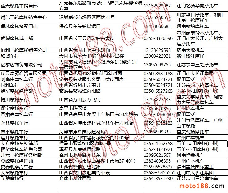 山西省摩托車整車經(jīng)銷商名錄