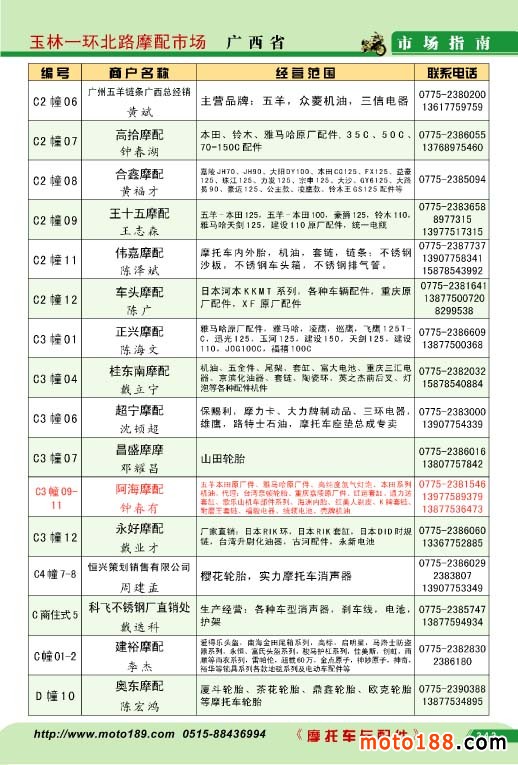 各摩配市場(chǎng)詳細(xì)資料請(qǐng)注冊(cè)我們的VIP會(huì)員咨詢 電話:0515-88436994 QQ:309362965、842467029、1051652573