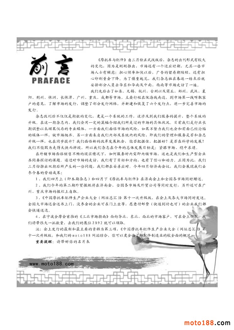 《摩托車與配件》自三月份正式改版后,雜志的    有較大的變化。因為是剛剛推出,市場還有一個適應時期,尤其一些市場人士有顧慮,擔心頻率加快以后廣告的留存期縮短,還有擔心印刷量會下降。為了慎重起見,我們雜志社在春運一結束后就安排部分人員去華東和華南及中南、西南等市場走了一遍。先后去了如皋、無錫、撫順、臺州以及商丘、鄭州、武漢、襄陽、荊州、株洲、長株潭、廣州、重慶、成都等市場,行程在隴海線南邊走了一圈。到市場第一線汲取客戶的意見,了解市場的發(fā)行,調整了部分發(fā)行點,并新建和恢復了六個發(fā)行點,進一步完善市場的發(fā)行。雜志改刊后不僅僅是期數的變化,更是一個系統(tǒng)的工作,這涉及到我們服務的提升,整個系統(tǒng)的升級。在這一期雜志內,我們會用一定的篇幅介紹我們所走過的市場的具體狀況。目前我們是行業(yè)長期調整以來僅存的專業(yè)媒體,一方面我們面臨市場的風險,如果不努力我們也會和前面已經淪陷的媒體一樣,被市場拋棄。另一方面來自我們內部及系統(tǒng)內的風險,即我們的管理和服務是否和雜志升級一樣,也在同步提升?我們面臨新的改革發(fā)展機會,我們能否把握住、把握好?在進行科學的發(fā)展時,不能因為太 太快而摔跤,所以我們雜志在今年的發(fā)展目標是:緊跟市場、穩(wěn)中求進。在外銷市場面臨銷售不暢的現實情況下,如何服務好內需內銷市場,這也是我們和生產型企業(yè)共同要探討的課題。通過對市場的走訪,我們有了目標和方向,也有了信心和動力。正因為此,我們三月份推出雙期后所產生的一系列問題,我們都在妥善應對。今年四月份濟南會議,我們會展現我們去冬今春的勞動成果: