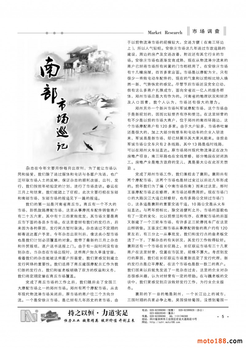 《摩托車與配件》自三月份正式改版后,雜志的    有較大的變化。因?yàn)槭莿倓偼瞥觯袌?chǎng)還有一個(gè)適應(yīng)時(shí)期,尤其一些市場(chǎng)人士有顧慮,擔(dān)心頻率加快以后廣告的留存期縮短,還有擔(dān)心印刷量會(huì)下降。為了慎重起見,我們雜志社在春運(yùn)一結(jié)束后就安排部分人員去華東和華南及中南、西南等市場(chǎng)走了一遍。先后去了如皋、無錫、撫順、臺(tái)州以及商丘、鄭州、武漢、襄陽、荊州、株洲、長(zhǎng)株潭、廣州、重慶、成都等市場(chǎng),行程在隴海線南邊走了一圈。到市場(chǎng)第一線汲取客戶的意見,了解市場(chǎng)的發(fā)行,調(diào)整了部分發(fā)行點(diǎn),并新建和恢復(fù)了六個(gè)發(fā)行點(diǎn),進(jìn)一步完善市場(chǎng)的發(fā)行。雜志改刊后不僅僅是期數(shù)的變化,更是一個(gè)系統(tǒng)的工作,這涉及到我們服務(wù)的提升,整個(gè)系統(tǒng)的升級(jí)。在這一期雜志內(nèi),我們會(huì)用一定的篇幅介紹我們所走過的市場(chǎng)的具體狀況。目前我們是行業(yè)長(zhǎng)期調(diào)整以來僅存的專業(yè)媒體,一方面我們面臨市場(chǎng)的風(fēng)險(xiǎn),如果不努力我們也會(huì)和前面已經(jīng)淪陷的媒體一樣,被市場(chǎng)拋棄。另一方面來自我們內(nèi)部及系統(tǒng)內(nèi)的風(fēng)險(xiǎn),即我們的管理和服務(wù)是否和雜志升級(jí)一樣,也在同步提升?我們面臨新的改革發(fā)展機(jī)會(huì),我們能否把握住、把握好?在進(jìn)行科學(xué)的發(fā)展時(shí),不能因?yàn)樘?nbsp;太快而摔跤,所以我們雜志在今年的發(fā)展目標(biāo)是:緊跟市場(chǎng)、穩(wěn)中求進(jìn)。在外銷市場(chǎng)面臨銷售不暢的現(xiàn)實(shí)情況下,如何服務(wù)好內(nèi)需內(nèi)銷市場(chǎng),這也是我們和生產(chǎn)型企業(yè)共同要探討的課題。通過對(duì)市場(chǎng)的走訪,我們有了目標(biāo)和方向,也有了信心和動(dòng)力。正因?yàn)榇?,我們?nèi)路萃瞥鲭p期后所產(chǎn)生的一系列問題,我們都在妥善應(yīng)對(duì)。今年四月份濟(jì)南會(huì)議,我們會(huì)展現(xiàn)我們?nèi)ザ翊旱膭趧?dòng)成果: