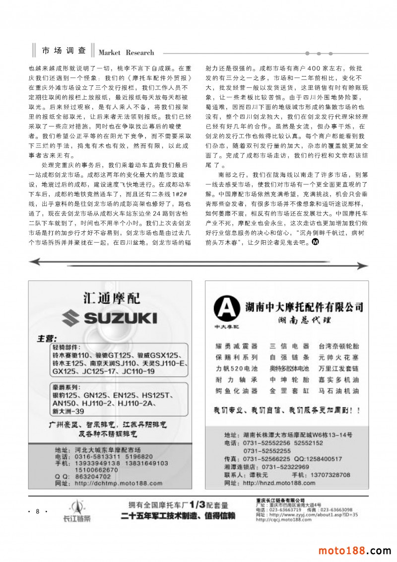 《摩托車與配件》自三月份正式改版后,雜志的 有較大的變化。因?yàn)槭莿倓偼瞥觯袌?chǎng)還有一個(gè)適應(yīng)時(shí)期,尤其一些市場(chǎng)人士有顧慮,擔(dān)心頻率加快以后廣告的留存期縮短,還有擔(dān)心印刷量會(huì)下降。為了慎重起見(jiàn),我們雜志社在春運(yùn)一結(jié)束后就安排部分人員去華東和華南及中南、西南等市場(chǎng)走了一遍。先后去了如皋、無(wú)錫、撫順、臺(tái)州以及商丘、鄭州、武漢、襄陽(yáng)、荊州、株洲、長(zhǎng)株潭、廣州、重慶、成都等市場(chǎng),行程在隴海線南邊走了一圈。到市場(chǎng)第一線汲取客戶的意見(jiàn),了解市場(chǎng)的發(fā)行,調(diào)整了部分發(fā)行點(diǎn),并新建和恢復(fù)了六個(gè)發(fā)行點(diǎn),進(jìn)一步完善市場(chǎng)的發(fā)行。雜志改刊后不僅僅是期數(shù)的變化,更是一個(gè)系統(tǒng)的工作,這涉及到我們服務(wù)的提升,整個(gè)系統(tǒng)的升級(jí)。在這一期雜志內(nèi),我們會(huì)用一定的篇幅介紹我們所走過(guò)的市場(chǎng)的具體狀況。目前我們是行業(yè)長(zhǎng)期調(diào)整以來(lái)僅存的專業(yè)媒體,一方面我們面臨市場(chǎng)的風(fēng)險(xiǎn),如果不努力我們也會(huì)和前面已經(jīng)淪陷的媒體一樣,被市場(chǎng)拋棄。另一方面來(lái)自我們內(nèi)部及系統(tǒng)內(nèi)的風(fēng)險(xiǎn),即我們的管理和服務(wù)是否和雜志升級(jí)一樣,也在同步提升?我們面臨新的改革發(fā)展機(jī)會(huì),我們能否把握住、把握好?在進(jìn)行科學(xué)的發(fā)展時(shí),不能因?yàn)樘?nbsp;太快而摔跤,所以我們雜志在今年的發(fā)展目標(biāo)是:緊跟市場(chǎng)、穩(wěn)中求進(jìn)。在外銷市場(chǎng)面臨銷售不暢的現(xiàn)實(shí)情況下,如何服務(wù)好內(nèi)需內(nèi)銷市場(chǎng),這也是我們和生產(chǎn)型企業(yè)共同要探討的課題。通過(guò)對(duì)市場(chǎng)的走訪,我們有了目標(biāo)和方向,也有了信心和動(dòng)力。正因?yàn)榇耍覀內(nèi)路萃瞥鲭p期后所產(chǎn)生的一系列問(wèn)題,我們都在妥善應(yīng)對(duì)。今年四月份濟(jì)南會(huì)議,我們會(huì)展現(xiàn)我們?nèi)ザ翊旱膭趧?dòng)成果: