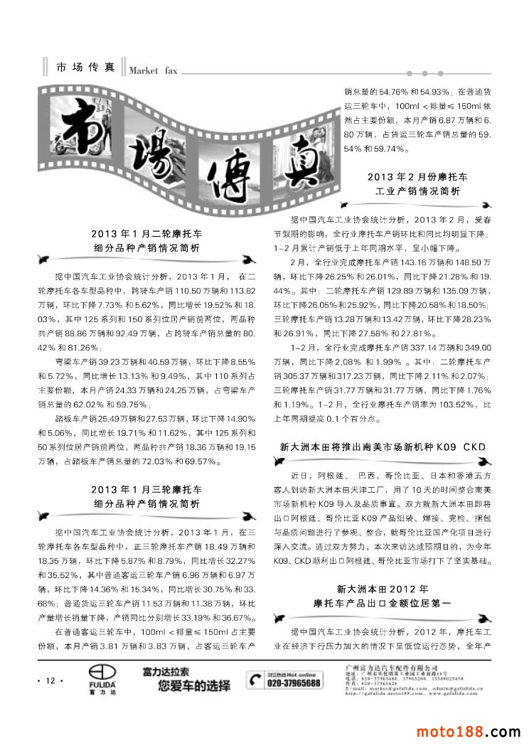 《摩托車與配件》自三月份正式改版后,雜志的 有較大的變化。因?yàn)槭莿倓偼瞥觯袌?chǎng)還有一個(gè)適應(yīng)時(shí)期,尤其一些市場(chǎng)人士有顧慮,擔(dān)心頻率加快以后廣告的留存期縮短,還有擔(dān)心印刷量會(huì)下降。為了慎重起見,我們雜志社在春運(yùn)一結(jié)束后就安排部分人員去華東和華南及中南、西南等市場(chǎng)走了一遍。先后去了如皋、無錫、撫順、臺(tái)州以及商丘、鄭州、武漢、襄陽、荊州、株洲、長株潭、廣州、重慶、成都等市場(chǎng),行程在隴海線南邊走了一圈。到市場(chǎng)第一線汲取客戶的意見,了解市場(chǎng)的發(fā)行,調(diào)整了部分發(fā)行點(diǎn),并新建和恢復(fù)了六個(gè)發(fā)行點(diǎn),進(jìn)一步完善市場(chǎng)的發(fā)行。雜志改刊后不僅僅是期數(shù)的變化,更是一個(gè)系統(tǒng)的工作,這涉及到我們服務(wù)的提升,整個(gè)系統(tǒng)的升級(jí)。在這一期雜志內(nèi),我們會(huì)用一定的篇幅介紹我們所走過的市場(chǎng)的具體狀況。目前我們是行業(yè)長期調(diào)整以來僅存的專業(yè)媒體,一方面我們面臨市場(chǎng)的風(fēng)險(xiǎn),如果不努力我們也會(huì)和前面已經(jīng)淪陷的媒體一樣,被市場(chǎng)拋棄。另一方面來自我們內(nèi)部及系統(tǒng)內(nèi)的風(fēng)險(xiǎn),即我們的管理和服務(wù)是否和雜志升級(jí)一樣,也在同步提升?我們面臨新的改革發(fā)展機(jī)會(huì),我們能否把握住、把握好?在進(jìn)行科學(xué)的發(fā)展時(shí),不能因?yàn)樘?nbsp;太快而摔跤,所以我們雜志在今年的發(fā)展目標(biāo)是:緊跟市場(chǎng)、穩(wěn)中求進(jìn)。在外銷市場(chǎng)面臨銷售不暢的現(xiàn)實(shí)情況下,如何服務(wù)好內(nèi)需內(nèi)銷市場(chǎng),這也是我們和生產(chǎn)型企業(yè)共同要探討的課題。通過對(duì)市場(chǎng)的走訪,我們有了目標(biāo)和方向,也有了信心和動(dòng)力。正因?yàn)榇?,我們?nèi)路萃瞥鲭p期后所產(chǎn)生的一系列問題,我們都在妥善應(yīng)對(duì)。今年四月份濟(jì)南會(huì)議,我們會(huì)展現(xiàn)我們?nèi)ザ翊旱膭趧?dòng)成果:
