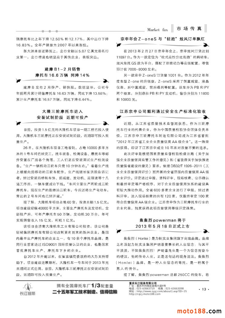 有較大的變化。因為是剛剛推出,市場還有一個適應(yīng)時期,尤其一些市場人士有顧慮,擔(dān)心頻率加快以后廣告的留存期縮短,還有擔(dān)心印刷量會下降。為了慎重起見,我們雜志社在春運(yùn)一結(jié)束后就安排部分人員去華東和華南及中南、西南等市場走了一遍。先后去了如皋、無錫、撫順、臺州以及商丘、鄭州、武漢、襄陽、荊州、株洲、長株潭、廣州、重慶、成都等市場,行程在隴海線南邊走了一圈。到市場第一線汲取客戶的意見,了解市場的發(fā)行,調(diào)整了部分發(fā)行點,并新建和恢復(fù)了六個發(fā)行點,進(jìn)一步完善市場的發(fā)行。雜志改刊后不僅僅是期數(shù)的變化,更是一個系統(tǒng)的工作,這涉及到我們服務(wù)的提升,整個系統(tǒng)的升級。在這一期雜志內(nèi),我們會用一定的篇幅介紹我們所走過的市場的具體狀況。目前我們是行業(yè)長期調(diào)整以來僅存的專業(yè)媒體,一方面我們面臨市場的風(fēng)險,如果不努力我們也會和前面已經(jīng)淪陷的媒體一樣,被市場拋棄。另一方面來自我們內(nèi)部及系統(tǒng)內(nèi)的風(fēng)險,即我們的管理和服務(wù)是否和雜志升級一樣,也在同步提升?我們面臨新的改革發(fā)展機(jī)會,我們能否把握住、把握好?在進(jìn)行科學(xué)的發(fā)展時,不能因為太 太快而摔跤,所以我們雜志在今年的發(fā)展目標(biāo)是:緊跟市場、穩(wěn)中求進(jìn)。在外銷市場面臨銷售不暢的現(xiàn)實情況下,如何服務(wù)好內(nèi)需內(nèi)銷市場,這也是我們和生產(chǎn)型企業(yè)共同要探討的課題。通過對市場的走訪,我們有了目標(biāo)和方向,也有了信心和動力。正因為此,我們?nèi)路萃瞥鲭p期后所產(chǎn)生的一系列問題,我們都在妥善應(yīng)對。今年四月份濟(jì)南會議,我們會展現(xiàn)我們?nèi)ザ翊旱膭趧映晒?/div>