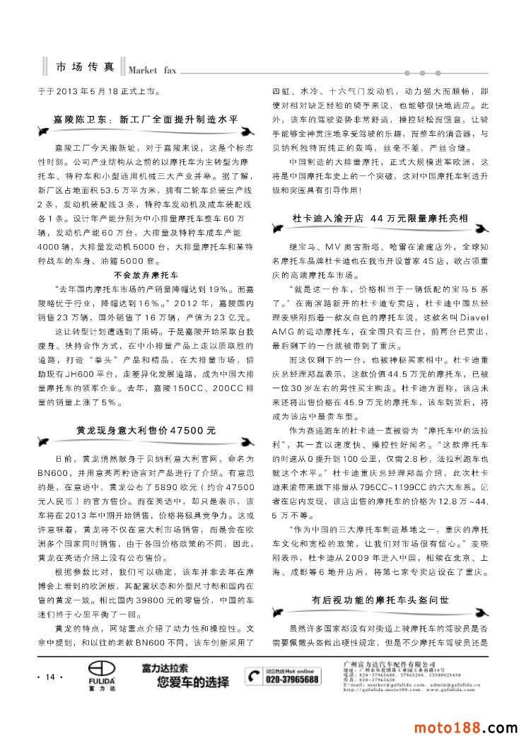 《摩托車與配件》自三月份正式改版后,雜志的    有較大的變化。因?yàn)槭莿倓偼瞥?,市?chǎng)還有一個(gè)適應(yīng)時(shí)期,尤其一些市場(chǎng)人士有顧慮,擔(dān)心頻率加快以后廣告的留存期縮短,還有擔(dān)心印刷量會(huì)下降。為了慎重起見,我們雜志社在春運(yùn)一結(jié)束后就安排部分人員去華東和華南及中南、西南等市場(chǎng)走了一遍。先后去了如皋、無錫、撫順、臺(tái)州以及商丘、鄭州、武漢、襄陽、荊州、株洲、長(zhǎng)株潭、廣州、重慶、成都等市場(chǎng),行程在隴海線南邊走了一圈。到市場(chǎng)第一線汲取客戶的意見,了解市場(chǎng)的發(fā)行,調(diào)整了部分發(fā)行點(diǎn),并新建和恢復(fù)了六個(gè)發(fā)行點(diǎn),進(jìn)一步完善市場(chǎng)的發(fā)行。雜志改刊后不僅僅是期數(shù)的變化,更是一個(gè)系統(tǒng)的工作,這涉及到我們服務(wù)的提升,整個(gè)系統(tǒng)的升級(jí)。在這一期雜志內(nèi),我們會(huì)用一定的篇幅介紹我們所走過的市場(chǎng)的具體狀況。目前我們是行業(yè)長(zhǎng)期調(diào)整以來僅存的專業(yè)媒體,一方面我們面臨市場(chǎng)的風(fēng)險(xiǎn),如果不努力我們也會(huì)和前面已經(jīng)淪陷的媒體一樣,被市場(chǎng)拋棄。另一方面來自我們內(nèi)部及系統(tǒng)內(nèi)的風(fēng)險(xiǎn),即我們的管理和服務(wù)是否和雜志升級(jí)一樣,也在同步提升?我們面臨新的改革發(fā)展機(jī)會(huì),我們能否把握住、把握好?在進(jìn)行科學(xué)的發(fā)展時(shí),不能因?yàn)樘?nbsp;太快而摔跤,所以我們雜志在今年的發(fā)展目標(biāo)是:緊跟市場(chǎng)、穩(wěn)中求進(jìn)。在外銷市場(chǎng)面臨銷售不暢的現(xiàn)實(shí)情況下,如何服務(wù)好內(nèi)需內(nèi)銷市場(chǎng),這也是我們和生產(chǎn)型企業(yè)共同要探討的課題。通過對(duì)市場(chǎng)的走訪,我們有了目標(biāo)和方向,也有了信心和動(dòng)力。正因?yàn)榇?,我們?nèi)路萃瞥鲭p期后所產(chǎn)生的一系列問題,我們都在妥善應(yīng)對(duì)。今年四月份濟(jì)南會(huì)議,我們會(huì)展現(xiàn)我們?nèi)ザ翊旱膭趧?dòng)成果: