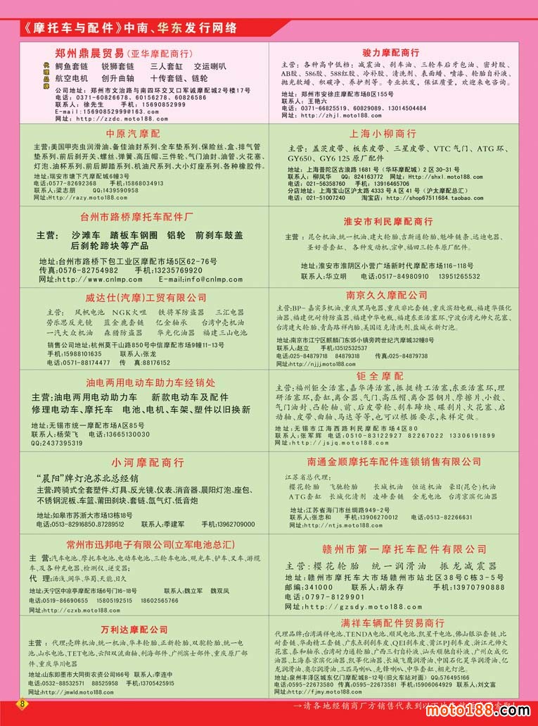 3、《中國(guó)摩托車配件生產(chǎn)企業(yè)大全(網(wǎng)址總匯)》第十一次升級(jí)版,在會(huì)上及各大市場(chǎng)同時(shí)發(fā)送。全國(guó)大市場(chǎng)還會(huì)送書上門,沒參會(huì)的企業(yè)可在門上坐等,愿意付郵費(fèi)(快遞到付也可)的企業(yè)我們都會(huì)快遞送達(dá)。