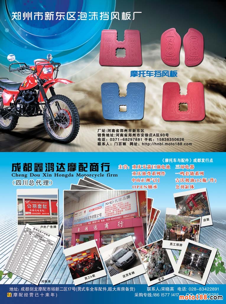 2013.4月(下半刊)雜志日期:2013-04-17 點(diǎn)擊:2512 查看原圖 全部展開![]() ![]() ![]() 后彩44 鄭州市新東區(qū)泡沫擋風(fēng)板廠+成都鑫鴻達(dá)摩配商行