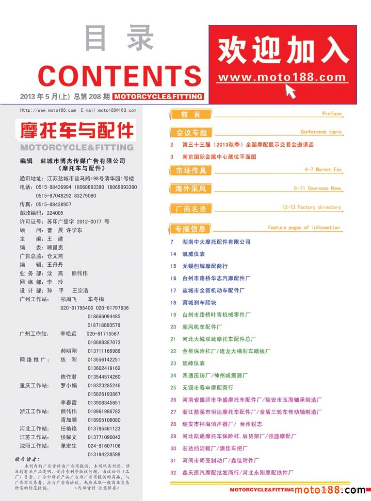 目前行業(yè)只有我們是碩果僅存的媒體,全國有七十幾個大大小小的集散市場,和分散在各地市、縣、鎮(zhèn)的幾萬家經(jīng)營散戶。姑且不算國外市場,就國內(nèi)摩配行業(yè)而言也算是。經(jīng)過這么多年的調(diào)整,都先后轉(zhuǎn)向了,如果一年出十二期雜志,對于整個摩配行業(yè)來說確實是不夠的:周期長、時效性慢,不符合未來市場的需要。當(dāng)然,這需要一個適應(yīng)的過程,我們現(xiàn)在決定冬夏季各縮一期,讓節(jié)奏適應(yīng)市場。這兩年來我們雜志每年都有一些調(diào)整,來適應(yīng)市場的變化。不變是相對的,變是永恒的,尤其像《摩托車與配件》在上升和發(fā)展時期,更是在探索中前進(jìn),在前進(jìn)中發(fā)展。那些倒下的媒體就是因為缺少創(chuàng)新探索精神,墨守成規(guī),與社會發(fā)展趨勢漸行漸遠(yuǎn)而被時代所淘汰。
