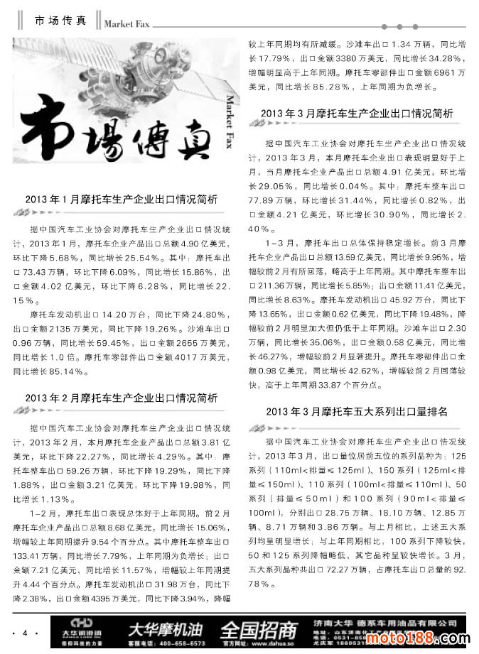 目前行業(yè)只有我們是碩果僅存的媒體,全國有七十幾個(gè)大大小小的集散市場,和分散在各地市、縣、鎮(zhèn)的幾萬家經(jīng)營散戶。姑且不算國外市場,就國內(nèi)摩配行業(yè)而言也算是。經(jīng)過這么多年的調(diào)整,都先后轉(zhuǎn)向了,如果一年出十二期雜志,對于整個(gè)摩配行業(yè)來說確實(shí)是不夠的:周期長、時(shí)效性慢,不符合未來市場的需要。當(dāng)然,這需要一個(gè)適應(yīng)的過程,我們現(xiàn)在決定冬夏季各縮一期,讓節(jié)奏適應(yīng)市場。這兩年來我們雜志每年都有一些調(diào)整,來適應(yīng)市場的變化。不變是相對的,變是永恒的,尤其像《摩托車與配件》在上升和發(fā)展時(shí)期,更是在探索中前進(jìn),在前進(jìn)中發(fā)展。那些倒下的媒體就是因?yàn)槿鄙賱?chuàng)新探索精神,墨守成規(guī),與社會(huì)發(fā)展趨勢漸行漸遠(yuǎn)而被時(shí)代所淘汰。