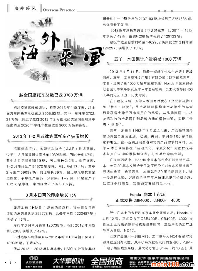 目前行業(yè)只有我們是碩果僅存的媒體,全國有七十幾個大大小小的集散市場,和分散在各地市、縣、鎮(zhèn)的幾萬家經(jīng)營散戶。姑且不算國外市場,就國內(nèi)摩配行業(yè)而言也算是。經(jīng)過這么多年的調(diào)整,都先后轉(zhuǎn)向了,如果一年出十二期雜志,對于整個摩配行業(yè)來說確實是不夠的:周期長、時效性慢,不符合未來市場的需要。當(dāng)然,這需要一個適應(yīng)的過程,我們現(xiàn)在決定冬夏季各縮一期,讓節(jié)奏適應(yīng)市場。這兩年來我們雜志每年都有一些調(diào)整,來適應(yīng)市場的變化。不變是相對的,變是永恒的,尤其像《摩托車與配件》在上升和發(fā)展時期,更是在探索中前進,在前進中發(fā)展。那些倒下的媒體就是因為缺少創(chuàng)新探索精神,墨守成規(guī),與社會發(fā)展趨勢漸行漸遠(yuǎn)而被時代所淘汰。