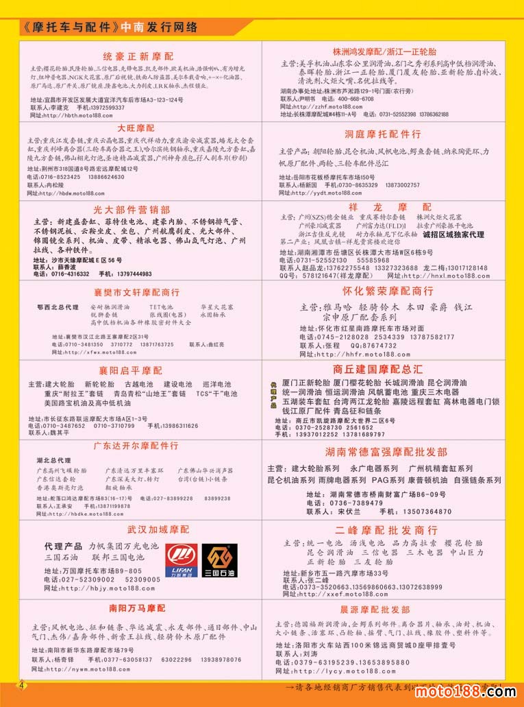 目前行業(yè)只有我們是碩果僅存的媒體,全國有七十幾個大大小小的集散市場,和分散在各地市、縣、鎮(zhèn)的幾萬家經(jīng)營散戶。姑且不算國外市場,就國內(nèi)摩配行業(yè)而言也算是。經(jīng)過這么多年的調(diào)整,都先后轉(zhuǎn)向了,如果一年出十二期雜志,對于整個摩配行業(yè)來說確實是不夠的:周期長、時效性慢,不符合未來市場的需要。當(dāng)然,這需要一個適應(yīng)的過程,我們現(xiàn)在決定冬夏季各縮一期,讓節(jié)奏適應(yīng)市場。這兩年來我們雜志每年都有一些調(diào)整,來適應(yīng)市場的變化。不變是相對的,變是永恒的,尤其像《摩托車與配件》在上升和發(fā)展時期,更是在探索中前進(jìn),在前進(jìn)中發(fā)展。那些倒下的媒體就是因為缺少創(chuàng)新探索精神,墨守成規(guī),與社會發(fā)展趨勢漸行漸遠(yuǎn)而被時代所淘汰。