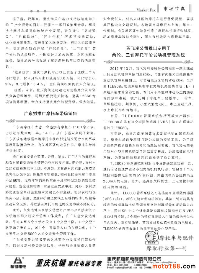 時節(jié)即將進入盛夏了,南方的天氣也越來越熱,國內(nèi)的內(nèi)銷市場,尤其是南方地區(qū)的市場將轉(zhuǎn)成淡季。根據(jù)我們今年的出刊計劃,我們從這個月也就是六月份開始至八月份每月出一期雜志。本期雜志是在六月中旬出刊;7月雜志將在七月上旬出刊,同時在中旬還會出刊今年的第三期《摩托車與配件外貿(mào)報》即夏季版(十月出刊秋季版);八月初出刊8月版;八月底至九月初出刊9月上半期雜志,十月中下旬出刊9月下半期雜志。請大家注意我們的出刊日期,及時 到我們的發(fā)行點領取。我們也會在moto188網(wǎng)站的公告欄及時通知大家雜志發(fā)貨的具體時間。