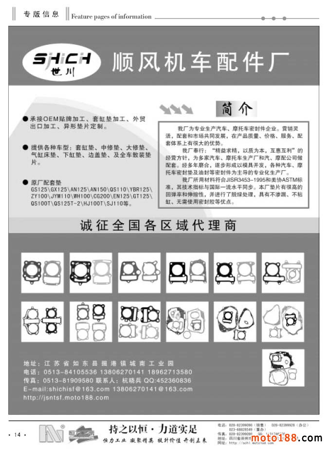 經(jīng)過幾次改刊后的發(fā)行情況來看,我們這種根據(jù)市場變化靈活出刊的形式逐步被企業(yè)所認(rèn)可。在發(fā)行上我們也是沒有打折扣,月出刊兩期后,黑白的內(nèi)容要比過去豐富得多,可讀性也在增強(qiáng)。六月變單期后,我們另增加8頁黑白的文字信息內(nèi)容,黑白每期為40頁。由于北方市場和南方市場淡旺季同期相反,所以在南方的淡季里,我們雜志在北方市場的發(fā)行數(shù)量將增加。不管南北市場淡旺不同,對我們來說,我們?nèi)詫⒁蝗缂韧刈龊梦覀兊墓ぷ?。從今?月份開始,我們工作人員將分別去福建、浙江、安徽和江西四省,走訪調(diào)研這四省的摩配市場,并將派送上萬份《外貿(mào)報》和工具書《配件生產(chǎn)企業(yè)大全》。同時,我們還將收集市場的最新資料,為下半年的《華東市場指南》做出書的準(zhǔn)備工作。目前這項工作進(jìn)展順利,廣告征集也在穩(wěn)步進(jìn)行。完成這些省份的調(diào)研工作,我們的信息采集工作也就到了收官階段。工作進(jìn)展快的話,我們就會提前結(jié)束這本書的編排。在10月24日的南京全摩會上,大家就可以看到這本書了。