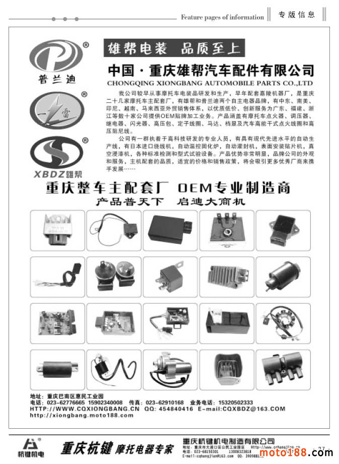 在這個淡季里,我們還將去西北和東北送書、送報上萬,走訪調(diào)研這些地區(qū)的市場。再次強(qiáng)調(diào),我們送的書是今年上半年在濟(jì)南全摩會首發(fā)的新版《中國摩托車配件生產(chǎn)企業(yè)大全》,送的報紙是《摩托車與配件外貿(mào)報》。我們的雜志還是由全國各發(fā)行點(diǎn)直接發(fā)放給市場上的經(jīng)營商戶。目前《大全》已完成在山東、河北、廣東和重慶等省市的主要市場的發(fā)行。今年年底之前完成對全國市場的投放。