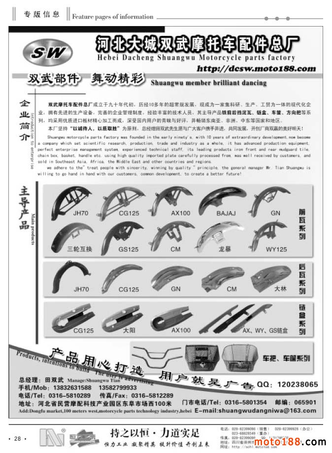 在這個淡季里,我們還將去西北和東北送書、送報上萬,走訪調(diào)研這些地區(qū)的市場。再次強調(diào),我們送的書是今年上半年在濟南全摩會首發(fā)的新版《中國摩托車配件生產(chǎn)企業(yè)大全》,送的報紙是《摩托車與配件外貿(mào)報》。我們的雜志還是由全國各發(fā)行點直接發(fā)放給市場上的經(jīng)營商戶。目前《大全》已完成在山東、河北、廣東和重慶等省市的主要市場的發(fā)行。今年年底之前完成對全國市場的投放。