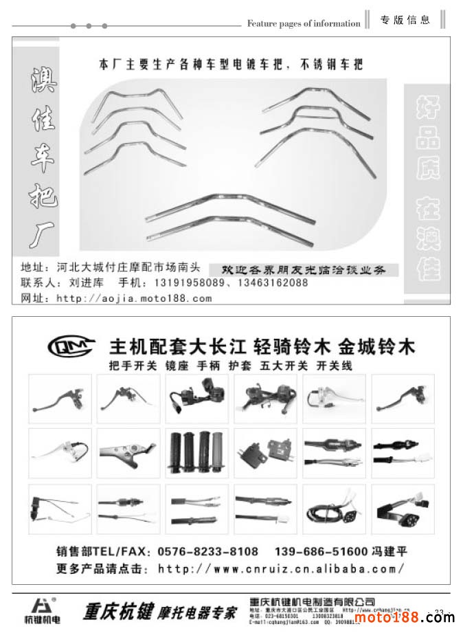 經(jīng)過幾次改刊后的發(fā)行情況來看,我們這種根據(jù)市場變化靈活出刊的形式逐步被企業(yè)所認(rèn)可。在發(fā)行上我們也是沒有打折扣,月出刊兩期后,黑白的內(nèi)容要比過去豐富得多,可讀性也在增強(qiáng)。六月變單期后,我們另增加8頁黑白的文字信息內(nèi)容,黑白每期為40頁。由于北方市場和南方市場淡旺季同期相反,所以在南方的淡季里,我們雜志在北方市場的發(fā)行數(shù)量將增加。不管南北市場淡旺不同,對(duì)我們來說,我們?nèi)詫⒁蝗缂韧刈龊梦覀兊墓ぷ?。從今?月份開始,我們工作人員將分別去福建、浙江、安徽和江西四省,走訪調(diào)研這四省的摩配市場,并將派送上萬份《外貿(mào)報(bào)》和工具書《配件生產(chǎn)企業(yè)大全》。同時(shí),我們還將收集市場的最新資料,為下半年的《華東市場指南》做出書的準(zhǔn)備工作。目前這項(xiàng)工作進(jìn)展順利,廣告征集也在穩(wěn)步進(jìn)行。完成這些省份的調(diào)研工作,我們的信息采集工作也就到了收官階段。工作進(jìn)展快的話,我們就會(huì)提前結(jié)束這本書的編排。在10月24日的南京全摩會(huì)上,大家就可以看到這本書了。