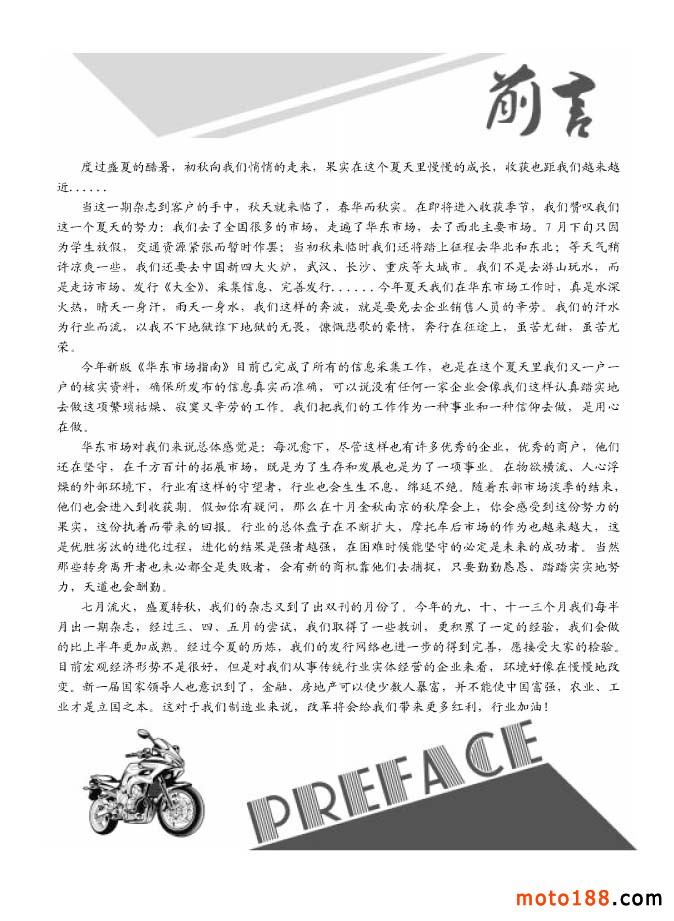 華東市場對我們來說總體感覺是:每況愈下,盡管這樣也有許多優(yōu)秀的企業(yè),優(yōu)秀的商戶,他們在還堅持,在千方百計的拓展市場,既是為了生存和發(fā)展也是為了一項事業(yè)。在物欲橫流、人心浮燥的外部環(huán)境下,行業(yè)有這樣的守望者,行業(yè)也會生生不息、綿延不絕。隨著東部市場淡季的結(jié)束,他們也會進入到收獲期。假如你有疑問,那么在十月金秋南京的秋摩會上,你會感受到這份努力的果實,這份執(zhí)著而帶來的回報。行業(yè)的總體盤子在不斷擴大,摩托車后市場的作為也越來越大,這是優(yōu)勝劣汰的進化過程,進化的結(jié)果是強者越強,在困難時候能堅守的必定是未來的成功者。當然那些轉(zhuǎn)身離開者也未必都全是失敗者,會有新的商機靠他們?nèi)ゲ蹲?,只要勤勤懇懇、踏踏實實地努力,天道也會酬勤?br />