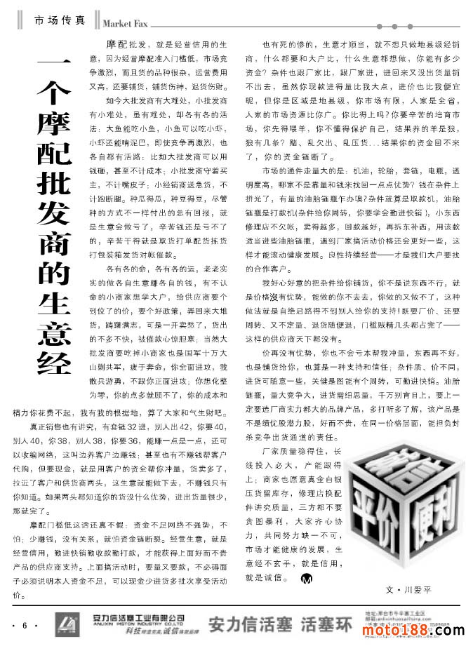 華東市場(chǎng)對(duì)我們來說總體感覺是:每況愈下,盡管這樣也有許多優(yōu)秀的企業(yè),優(yōu)秀的商戶,他們?cè)谶€堅(jiān)持,在千方百計(jì)的拓展市場(chǎng),既是為了生存和發(fā)展也是為了一項(xiàng)事業(yè)。在物欲橫流、人心浮燥的外部環(huán)境下,行業(yè)有這樣的守望者,行業(yè)也會(huì)生生不息、綿延不絕。隨著東部市場(chǎng)淡季的結(jié)束,他們也會(huì)進(jìn)入到收獲期。假如你有疑問,那么在十月金秋南京的秋摩會(huì)上,你會(huì)感受到這份努力的果實(shí),這份執(zhí)著而帶來的回報(bào)。行業(yè)的總體盤子在不斷擴(kuò)大,摩托車后市場(chǎng)的作為也越來越大,這是優(yōu)勝劣汰的進(jìn)化過程,進(jìn)化的結(jié)果是強(qiáng)者越強(qiáng),在困難時(shí)候能堅(jiān)守的必定是未來的成功者。當(dāng)然那些轉(zhuǎn)身離開者也未必都全是失敗者,會(huì)有新的商機(jī)靠他們?nèi)ゲ蹲?,只要勤勤懇懇、踏踏?shí)實(shí)地努力,天道也會(huì)酬勤。
