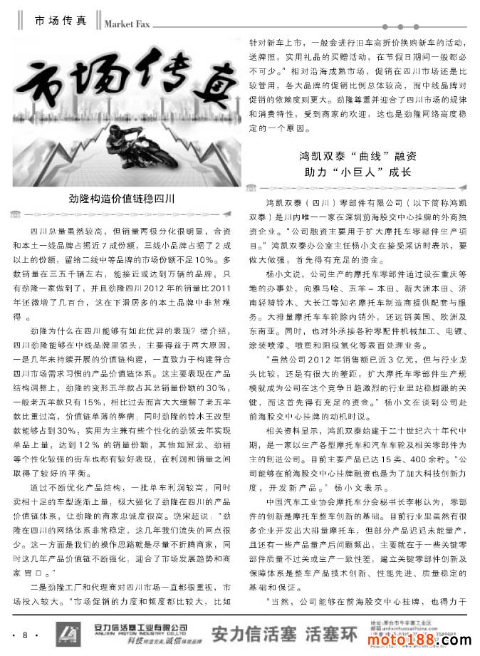 華東市場對我們來說總體感覺是:每況愈下,盡管這樣也有許多優(yōu)秀的企業(yè),優(yōu)秀的商戶,他們在還堅持,在千方百計的拓展市場,既是為了生存和發(fā)展也是為了一項事業(yè)。在物欲橫流、人心浮燥的外部環(huán)境下,行業(yè)有這樣的守望者,行業(yè)也會生生不息、綿延不絕。隨著東部市場淡季的結(jié)束,他們也會進入到收獲期。假如你有疑問,那么在十月金秋南京的秋摩會上,你會感受到這份努力的果實,這份執(zhí)著而帶來的回報。行業(yè)的總體盤子在不斷擴大,摩托車后市場的作為也越來越大,這是優(yōu)勝劣汰的進化過程,進化的結(jié)果是強者越強,在困難時候能堅守的必定是未來的成功者。當然那些轉(zhuǎn)身離開者也未必都全是失敗者,會有新的商機靠他們?nèi)ゲ蹲?,只要勤勤懇懇、踏踏實實地努力,天道也會酬勤?br />