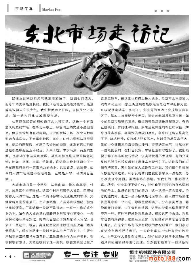 目前秋老虎終于收起了淫威,大部分地區(qū)氣候也慢慢地恢復(fù)到常態(tài),我們行業(yè)銷售的季節(jié)也開始了。我們雜志也從這個(gè)月開始出雙刊即半月一刊,由于是雙期,這一期的雜志相對(duì)較薄。完成全國(guó)摩配會(huì)議后,雜志還將根據(jù)行業(yè)具體情況作調(diào)整。受大環(huán)境的影響,尤其是國(guó)外市場(chǎng)的影響,今年的外貿(mào)形勢(shì)較去年相比形勢(shì)要差一些,在華南的外貿(mào)窗口也有所反映。從我們走訪的市場(chǎng)來看,盡管內(nèi)銷不旺,我們的北方市場(chǎng)(西北、華北和東北)在疲軟之中發(fā)展,至少從外觀上來說,不少市場(chǎng)面貌比以往有新的變化,這是市場(chǎng)的亮點(diǎn)。行業(yè)的冬季是這樣,那行業(yè)的春天會(huì)怎么樣呢?今年的秋季全國(guó)摩配展示交易會(huì)將在十月下旬南京召開,從會(huì)展的招展形勢(shì)來看,行業(yè)依然踴躍參與,包括明年春天在西安的全國(guó)摩配會(huì)議。從這么多企業(yè)的參與來看,行業(yè)同仁依然有一種精神在支持他們,不管市場(chǎng)的風(fēng)風(fēng)雨雨,我自巋然不動(dòng)。