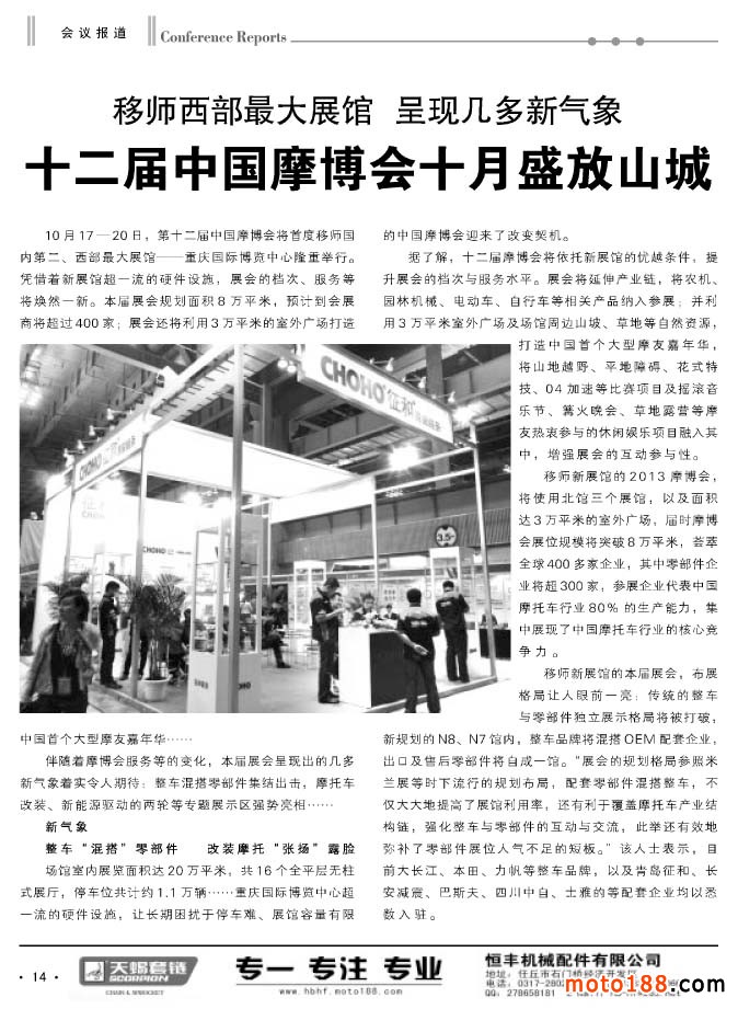 目前秋老虎終于收起了淫威,大部分地區(qū)氣候也慢慢地恢復(fù)到常態(tài),我們行業(yè)銷售的季節(jié)也開始了。我們雜志也從這個(gè)月開始出雙刊即半月一刊,由于是雙期,這一期的雜志相對較薄。完成全國摩配會議后,雜志還將根據(jù)行業(yè)具體情況作調(diào)整。受大環(huán)境的影響,尤其是國外市場的影響,今年的外貿(mào)形勢較去年相比形勢要差一些,在華南的外貿(mào)窗口也有所反映。從我們走訪的市場來看,盡管內(nèi)銷不旺,我們的北方市場(西北、華北和東北)在疲軟之中發(fā)展,至少從外觀上來說,不少市場面貌比以往有新的變化,這是市場的亮點(diǎn)。行業(yè)的冬季是這樣,那行業(yè)的春天會怎么樣呢?今年的秋季全國摩配展示交易會將在十月下旬南京召開,從會展的招展形勢來看,行業(yè)依然踴躍參與,包括明年春天在西安的全國摩配會議。從這么多企業(yè)的參與來看,行業(yè)同仁依然有一種精神在支持他們,不管市場的風(fēng)風(fēng)雨雨,我自巋然不動。