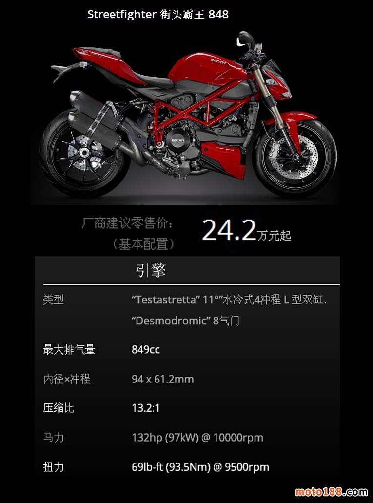 新款 Streetfighter-街頭霸王 848 將 848 Testastretta 11° 引擎和源自超級跑車 848 EVO 的新式 Trellis 車架外形完美地結(jié)合在一起,使它具有純粹的摩托車運動震撼力。杰出的操控性和精確性使 Streetfighter-街頭霸王 848 不可抗拒。 由新車架所提供的杰出操控性,Testastretta 11° 引擎提供的漸進式易控制的動力傳輸過程,穩(wěn)定舒適的駕駛位置和杜卡迪牽引力控制系統(tǒng)(對功率持續(xù)監(jiān)視)等都是對 Streetfighter-街頭霸王 即可爆發(fā)的迅猛、激情的騎行樂趣的最新詮釋。