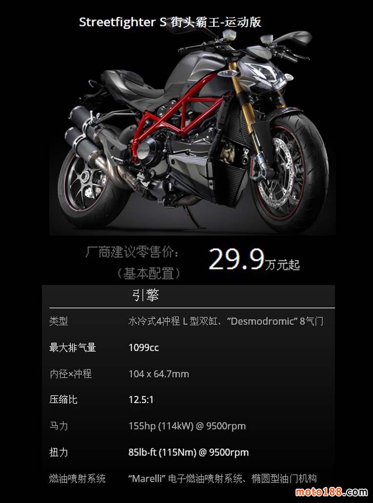 Streetfighter-街頭霸王 S-運動版 車款擁有超級跑車的靈魂,配合街頭戰(zhàn)士的風(fēng)格和裸車精髓,成為一臺激發(fā)腎上腺素的機器。Streetfighter-街頭霸王 S-運動版 讓杜卡迪街車晉升至另一境界,訴說不凡的傳奇。