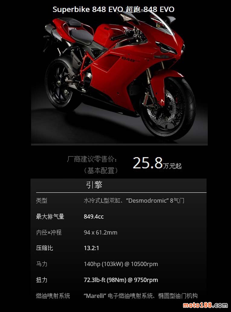 Superbike-超跑 848 EVO 車型的 Testastretta 發(fā)動機以及 Brembo 單活塞卡鉗所實現(xiàn)的強有力的制動力,將杜卡迪最輕量型超級跑車 848 EVO 的性能發(fā)揮到極致。進入杜卡迪的超級跑車世界將讓您感受到從未有過的刺激和精彩。