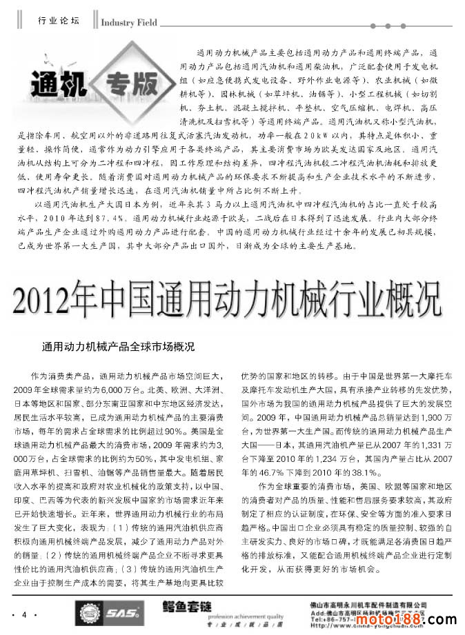 摩托車與配件》雜志為小型汽油機專輯,這似乎與摩托車配件不太相關(guān),但我們還是用心地去組織了與通機行業(yè)有關(guān)的技術(shù)、標準及資訊類的文章。我們編纂這個專輯也是有以下各方面的原因: