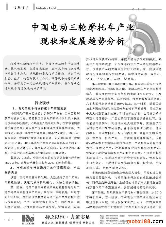 繼上期雜志我們做了小型通機(jī)的專題資訊報(bào)道之后,市場(chǎng)反映很好,這一期我們做了三輪摩托車的專題。三輪摩托車是今年摩托車市場(chǎng)的亮點(diǎn),在二輪車市場(chǎng)整體下滑的狀況下,今年三輪摩托車依然逆勢(shì)增長(zhǎng)。從現(xiàn)有統(tǒng)計(jì)數(shù)據(jù)看,今年增長(zhǎng)幅度大約在13%左右,總產(chǎn)量將超過500萬(wàn)輛。目前已經(jīng)形成以河南、重慶、廣東、山東等主要產(chǎn)區(qū),江蘇的淮海宗申是全行業(yè)最大的三輪車制造企業(yè),今年產(chǎn)銷量竟達(dá)到70多萬(wàn)輛。目前三輪車市場(chǎng)正是黃金年代,我們的配件制造企業(yè)有許多配件和三輪摩托車是相同的,大家不妨關(guān)注這個(gè)新興的面向廣闊農(nóng)村的市場(chǎng)。這些新的產(chǎn)業(yè)帶需要新的配套鏈,愿你們也成為這個(gè)產(chǎn)業(yè)鏈上的鏈節(jié),對(duì)從事摩托車配件產(chǎn)業(yè)的企業(yè)來說,這也是一個(gè)新的商機(jī)。今年我們?nèi)チ嗽S多市場(chǎng),有些地方已經(jīng)形成了單獨(dú)的三輪車市場(chǎng),一般摩配市場(chǎng)也增加了三輪車配件經(jīng)營(yíng)的門市,摩托車業(yè)不僅要向深度進(jìn)軍,也要橫向地向?qū)挾劝l(fā)展。作為輿論導(dǎo)向的媒體,我們也要向行業(yè)輸送正能量,為企業(yè)生產(chǎn)和經(jīng)營(yíng)出謀劃策。我們通過組織系列的資訊,讓企業(yè)能對(duì)新興的產(chǎn)業(yè)有個(gè)大致地了解,為企業(yè)的決策起到參謀作用。我們真誠(chéng)地希望,摩托車業(yè)的所有企業(yè)都能在這個(gè)行業(yè)健康有序地發(fā)展成長(zhǎng),共同壯大。