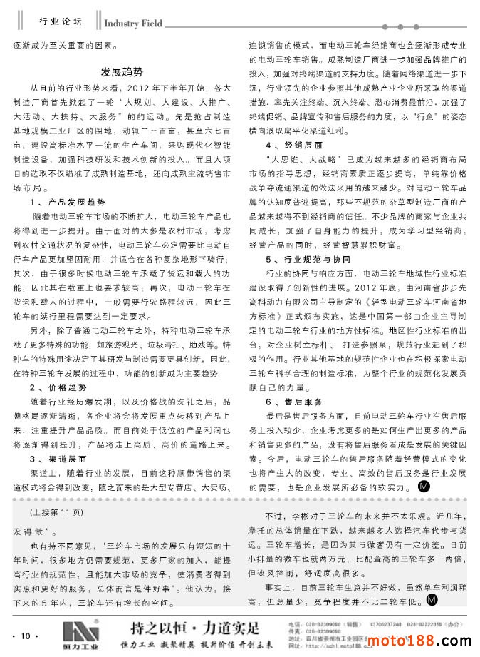 繼上期雜志我們做了小型通機(jī)的專題資訊報(bào)道之后,市場反映很好,這一期我們做了三輪摩托車的專題。三輪摩托車是今年摩托車市場的亮點(diǎn),在二輪車市場整體下滑的狀況下,今年三輪摩托車依然逆勢增長。從現(xiàn)有統(tǒng)計(jì)數(shù)據(jù)看,今年增長幅度大約在13%左右,總產(chǎn)量將超過500萬輛。目前已經(jīng)形成以河南、重慶、廣東、山東等主要產(chǎn)區(qū),江蘇的淮海宗申是全行業(yè)最大的三輪車制造企業(yè),今年產(chǎn)銷量竟達(dá)到70多萬輛。目前三輪車市場正是黃金年代,我們的配件制造企業(yè)有許多配件和三輪摩托車是相同的,大家不妨關(guān)注這個(gè)新興的面向廣闊農(nóng)村的市場。這些新的產(chǎn)業(yè)帶需要新的配套鏈,愿你們也成為這個(gè)產(chǎn)業(yè)鏈上的鏈節(jié),對(duì)從事摩托車配件產(chǎn)業(yè)的企業(yè)來說,這也是一個(gè)新的商機(jī)。今年我們?nèi)チ嗽S多市場,有些地方已經(jīng)形成了單獨(dú)的三輪車市場,一般摩配市場也增加了三輪車配件經(jīng)營的門市,摩托車業(yè)不僅要向深度進(jìn)軍,也要橫向地向?qū)挾劝l(fā)展。作為輿論導(dǎo)向的媒體,我們也要向行業(yè)輸送正能量,為企業(yè)生產(chǎn)和經(jīng)營出謀劃策。我們通過組織系列的資訊,讓企業(yè)能對(duì)新興的產(chǎn)業(yè)有個(gè)大致地了解,為企業(yè)的決策起到參謀作用。我們真誠地希望,摩托車業(yè)的所有企業(yè)都能在這個(gè)行業(yè)健康有序地發(fā)展成長,共同壯大。