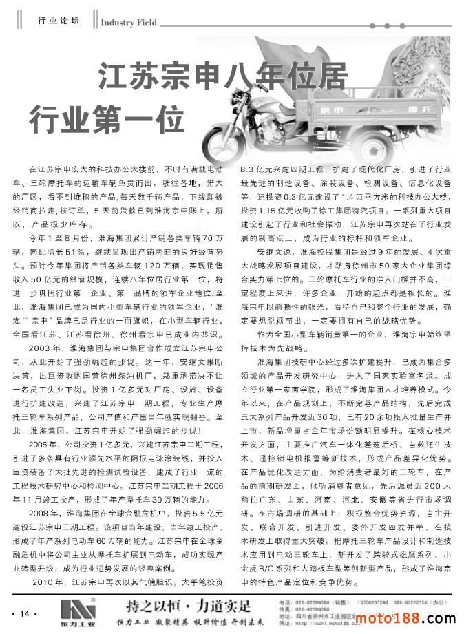 繼上期雜志我們做了小型通機(jī)的專題資訊報(bào)道之后,市場(chǎng)反映很好,這一期我們做了三輪摩托車的專題。三輪摩托車是今年摩托車市場(chǎng)的亮點(diǎn),在二輪車市場(chǎng)整體下滑的狀況下,今年三輪摩托車依然逆勢(shì)增長(zhǎng)。從現(xiàn)有統(tǒng)計(jì)數(shù)據(jù)看,今年增長(zhǎng)幅度大約在13%左右,總產(chǎn)量將超過(guò)500萬(wàn)輛。目前已經(jīng)形成以河南、重慶、廣東、山東等主要產(chǎn)區(qū),江蘇的淮海宗申是全行業(yè)最大的三輪車制造企業(yè),今年產(chǎn)銷量竟達(dá)到70多萬(wàn)輛。目前三輪車市場(chǎng)正是黃金年代,我們的配件制造企業(yè)有許多配件和三輪摩托車是相同的,大家不妨關(guān)注這個(gè)新興的面向廣闊農(nóng)村的市場(chǎng)。這些新的產(chǎn)業(yè)帶需要新的配套鏈,愿你們也成為這個(gè)產(chǎn)業(yè)鏈上的鏈節(jié),對(duì)從事摩托車配件產(chǎn)業(yè)的企業(yè)來(lái)說(shuō),這也是一個(gè)新的商機(jī)。今年我們?nèi)チ嗽S多市場(chǎng),有些地方已經(jīng)形成了單獨(dú)的三輪車市場(chǎng),一般摩配市場(chǎng)也增加了三輪車配件經(jīng)營(yíng)的門市,摩托車業(yè)不僅要向深度進(jìn)軍,也要橫向地向?qū)挾劝l(fā)展。作為輿論導(dǎo)向的媒體,我們也要向行業(yè)輸送正能量,為企業(yè)生產(chǎn)和經(jīng)營(yíng)出謀劃策。我們通過(guò)組織系列的資訊,讓企業(yè)能對(duì)新興的產(chǎn)業(yè)有個(gè)大致地了解,為企業(yè)的決策起到參謀作用。我們真誠(chéng)地希望,摩托車業(yè)的所有企業(yè)都能在這個(gè)行業(yè)健康有序地發(fā)展成長(zhǎng),共同壯大。