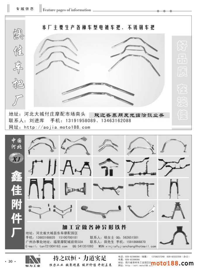 第三十三屆秋季全摩配也將于本月24-26日在南京國際會展中心召開,這是行業(yè)秋季大點兵。按照組委會的要求,大會的會刊將在本月15日抵達展館,所以也必須在國慶過后就得送去印刷。在今年秋季南京全摩會,我們還將為參會企業(yè)和觀展的經(jīng)銷商,贈送新版《華東市場指南》,由廣州工作站承制的《廣州市場導(dǎo)購指南》,今年第三期《摩托車與配件外貿(mào)報》,今年十月上、下期《摩托車與配件》雜志,以及部分庫存書——《中國摩托車配件生產(chǎn)企業(yè)大全》?!杜浼a(chǎn)企業(yè)大全》上半年在濟南首發(fā),目前除湖南、湖北及山西、廣西、河北部分市場沒有發(fā)放外,其余市場基本都是送書上門;還有部分省級市場由雜志發(fā)行點代理發(fā)送;沒有收到這本書的以及不在摩配市場的企業(yè)請到我們南京展位C89領(lǐng)取;還有《華南、三北、西南》三個市場的指南,也在會上發(fā)送。因為庫存的書不多,需要這些書的企業(yè)請盡量早去我們展位領(lǐng)取,送完即止。