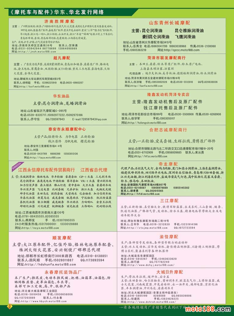 目前摩托車配件企業(yè)面臨比較嚴(yán)峻的市場(chǎng)現(xiàn)狀,但是我們了解到許多企業(yè)并不是坐以待毖,同時(shí)這個(gè)行業(yè)也在各個(gè)方面尋求突破,并且迎來(lái)了新的商機(jī)。我們雜志明年在信息發(fā)布上,也將增加和摩配行業(yè)有關(guān)的外延,如電動(dòng)摩托車、三輪摩托車、助力車、小型通機(jī)等。這些零部件,都是我們配件廠能制造的,技術(shù)也是相通的。目前電動(dòng)摩托、三輪摩托,小型通機(jī)市場(chǎng)都很不錯(cuò),產(chǎn)銷兩旺,有的還是有良好的發(fā)展遠(yuǎn)景。除了通過(guò)紙媒來(lái)推廣和普及外,我們的網(wǎng)站也將同時(shí)增加這方面的動(dòng)態(tài)信息,發(fā)布即時(shí)報(bào)道,開通這幾個(gè)板塊的專題,為行業(yè)傳輸更多的信息;我們的網(wǎng)站也將在今冬明春大改版,進(jìn)一步擴(kuò)容。在嚴(yán)峻的形勢(shì)下,我們一定要逆流而上,拓展生存和發(fā)展空間,同時(shí)我們也會(huì)將這幾方面的信息向行業(yè)傳遞,供行業(yè)企業(yè)決策參考。當(dāng)然我們更要在市場(chǎng)的第一線增加發(fā)行,補(bǔ)充完善這幾方面的信息數(shù)據(jù)庫(kù)。這些工作先從各省會(huì)城市開始,由大市場(chǎng)向小市場(chǎng)拓展,充分利用現(xiàn)行發(fā)行網(wǎng)絡(luò)的功能,增加不同行業(yè)和市場(chǎng)的發(fā)行。